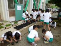児童会の呼びかけで、全校児童がアサガオの種まきをしました。