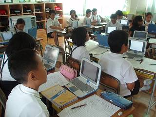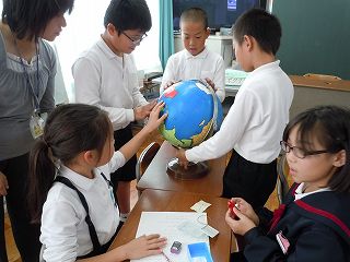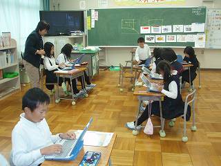 世界(日本以外の国)の給食について調べたことを、タブレットPCを使ってプレゼンにまとめています。