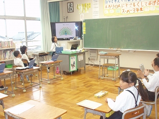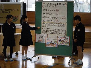 食育アンケートの結果をふまえ、みんなで朝ごはんの大切さについて考えました。