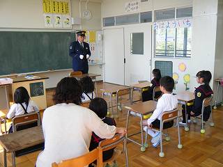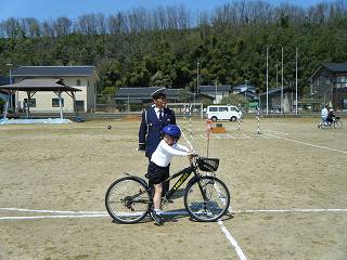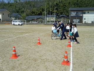 1年生は、道路の歩き方と不審者への対応の仕方を警察官に教えてもらいました。4年生は、自転車の乗り方を教えてもらい、交通ルールについて学ぶことができました。これからも車に気をつけて、安全に登下校して欲しいです。