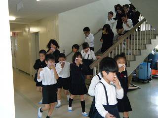 今日、2時間目に理科室から火災が出たという想定で避難訓練をしました。