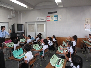 外部講師の先生に来て頂き、鍵盤ハーモニカやうた口ホースの使い方などを学習しました。手を猫の手にして鍵盤に置くことやおへその場所にドが来るように鍵盤を置くなど基本的な使い方をわかりやすく教えてくれました。