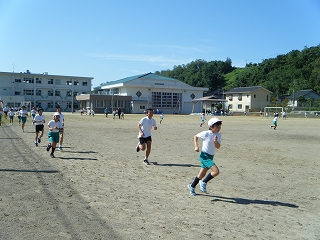 スポーツの秋。今日から長休み時間に8分間のかけ足運動が始まりました。高く澄み渡った秋空の下、児童は走り方や息の整え方などを先生から指導を受けながら一生懸命に各学年のコースを走りました。