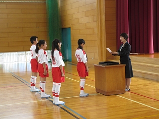 各学年の代表児童が、名前を呼ばれると大きな声で返事をすることができました。次に、後期委員会の委員長紹介がありました。全校児童の前で6年生の委員長は、めあてと抱負を堂々と話していました。後期の委員長のみなさん、頼みましたよ。