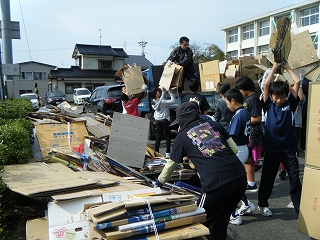 明け方の雨も上がり、8時から予定どおり資源回収が行われました。PTAのお父さん、お母さん、高学年児童が意気揚々とトラック等に乗り込み、精力的に集め回ってくださいました。