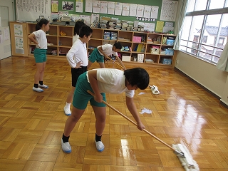 縦割り班に分かれて、黙々とそうじをしています。