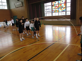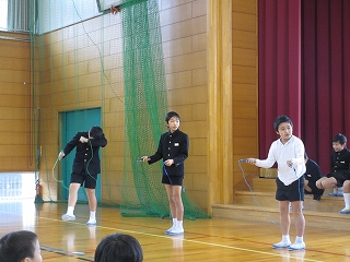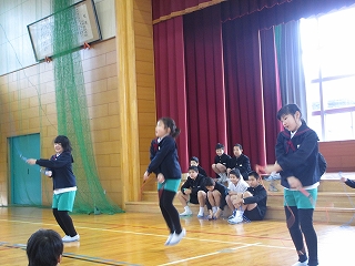 高学年が、全校児童の前で得意な縄跳びの技を見せてくれました。