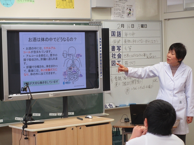 学校薬剤師の金田先生が、危険ドラッグ、タバコ、お酒の話などを子供達に