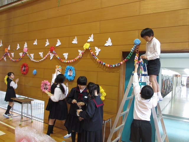 4年生は、体育館の壁面の飾り付けを頑張っています。