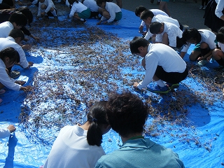 今日は、縦割り班ごとに種取りを競い合いました。どれだけ取れたのか結果発表が楽しみですね。これらの種は来年もまた蒔きます。みんなが教室に戻った後、5年生がきれいに後片付けをしていました。