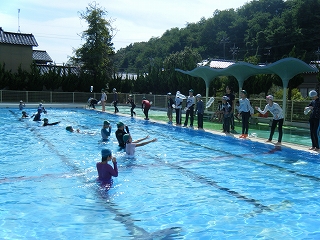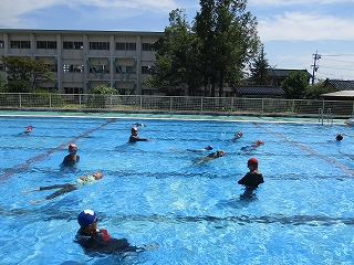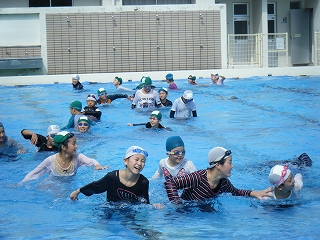 川や海でおぼれたときに自分の身を守ったり、溺れている人を助けたりする方法を学習しました。まず、初めにプールに着衣で入り、重たさや動きにくさを体感しました。意外と重いことや不快な感じを実感したようでした。次に、浮いて待つことや、岸にいる人は溺れている人に空の栓を閉めたペットボトルを投げてあげるとよいこと、そのペットボトルを胸の上に抱いてラッコのように浮くことなどを体験しました。