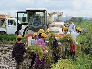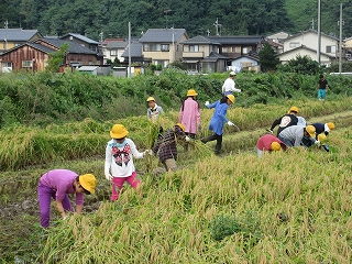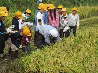 西荒屋地区の水田をお借りして、5年生が米作りの体験をさせてもらっています。この日は、春に田植えをした小さな苗が立派に実ったイネを鎌で刈り取る作業を行いました。水田の持ち主でお世話をしてくださっている指導者の方から手順と鎌の使い方を教えていただいた後、初めは慣れない手つきで危なかしかったのですが、だんだん上手に刈り取っていきました。イネの実りに驚き、汗をかいて働くことの一端を経験できた子どもたちでした。