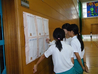 今日は、大雨、強風で運動会の予行が明日に延期になりましたが、どの学年も運動会に向けて張り切っています。応援や演技の練習では、どうしたらうまくいくか話し合っている姿。椅子の脚が土で汚れないようにビニル袋をかぶせる、目標を書いて気合いを入れる、など物や心の準備。授業には落ち着いて取り組み、休み時間には係の仕事。子どもたちはよくがんばっています。みんなで運動会を成功させましょう。