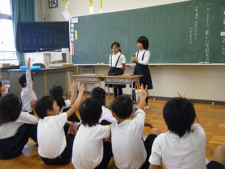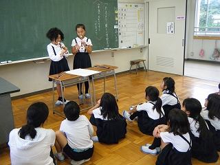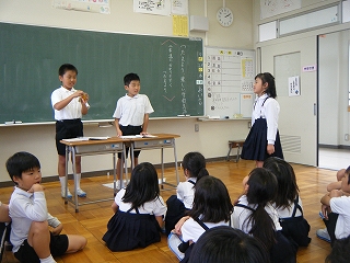2016年9月29日 16時19分 3年生の国語「つたえよう楽しい学校生活」の学習を行いました。3年生の児童は、「2年生の子たちに来年勉強することを教えたい」いう思いから、3年生になって初めて学習する「毛筆」「リコーダー」そして「うさぎ当番」についてをテーマに発表をしました。分かりやすく発表するために、実物を見せたり、クイズを出したり、とどのグループも工夫をしていました。