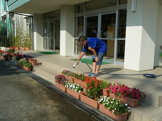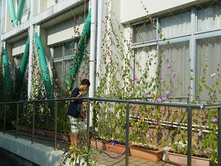 朝顔のグリーンカーテンや、サルビアなどの人権の花に、5年生が毎日、水やりのお世話に来ています。花々は生き生きと咲き誇り、わたしたちに元気やうるおいを与えてくれています。