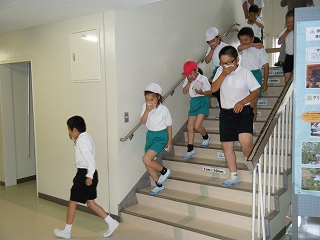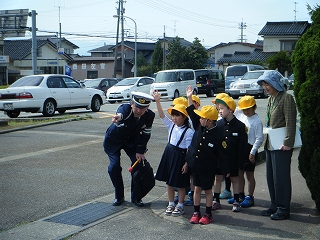 1年生はお巡りさんから話を聞いたあと、DVDを見て、実際に横断歩道を渡る練習をしました。信号が青でも、右・左を確認すること、横断歩道では止まって、見て、確かめてから渡ることを一人一人がやってみて確認することができました。