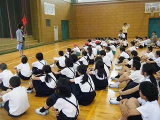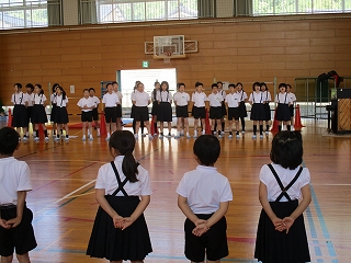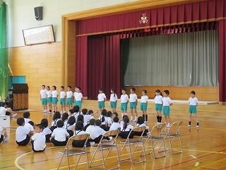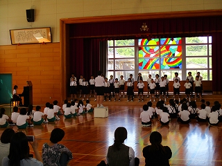 6限目は、4年生による器械運動の発表、5・6年生による音楽会の合唱発表がありました。4年生は、先日6月1日に町器械運動交歓会があり、それまでに練習してきた成果を全校のみんな、そしてお家の人たちの前で発表しました。5・6年生は、6月15日に郡市音楽会が行われます。そこで歌う曲を聴いていただきました。