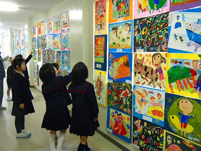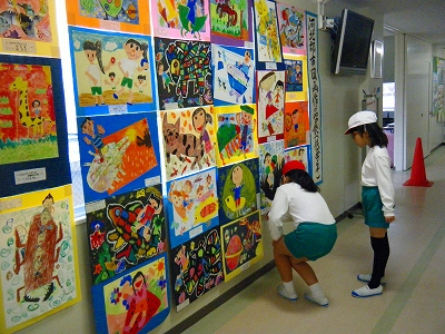1月に入って、本校に高学年、中学年、低学年とそれぞれの河北郡市図画作品が回ってきて展示されていました。どれも素晴らしい作品で、子どもたちは歓声をあげて見入っていました。心や感性を磨くすてきな機会でした。