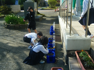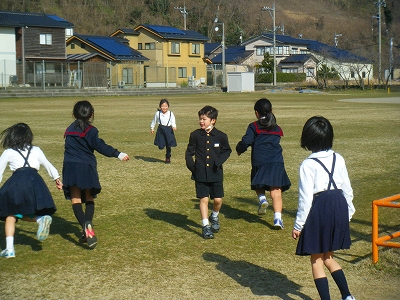 今日は、とてもいい天気で暖かく、白山もきれいに見えます。長休みになると、1年生や2年生が玄関から外に出るやいなや、「あったかーい!」と両手を広げて、空を見上げていました。「あっ、芽が出てる!」とチューリップの球根などを植えた植木鉢に駆け寄ったり、芝生の運動場を駆け回ったりするなど、春を感じて元気いっぱいの姿が見られました。
