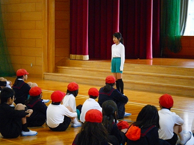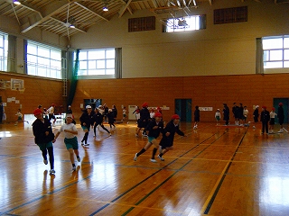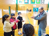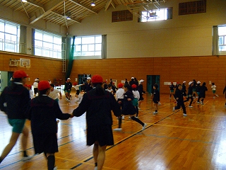 長休みに企画委員がなかよしチームを使っての全校遊びを催してくれました。初めに企画委員の挨拶があり、その後、船長さんの命令という遊びや鬼ごっこをしました。鬼ごっこは、スキップ星人や手つなぎ星人が地球人をつかまえるという設定で、大変盛り上がりました。今日は、雪の降る寒い日でしたが、心も体も温かそうでした。
