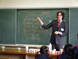 長休みに国際交流員のベンジャミン先生が英語での工作教室を開いてくださいました。今回は、せんたくのりやホウ酸などを使ってのスライム作りです。