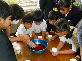 ベンジャミン先生の「Get glue」「What color do you like? 」「Mix it up」 などの英語を聞きながら、子どもたちは熱心に作っていました。だんだんお餅のように粘ってくると、歓声をあげながら友だち同士で見せ合って楽しんでいました。