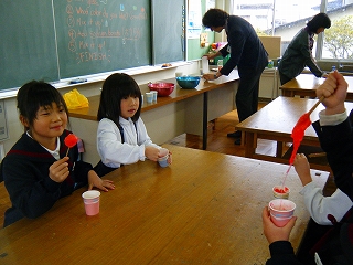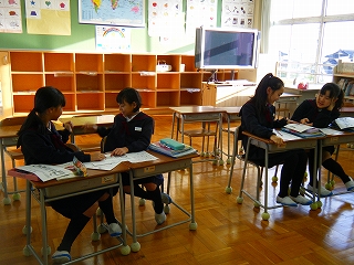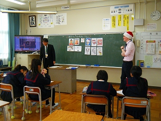 1限目、5年生は、ALTのローワン先生からいろいろな動作の英語の発音を何回も聞いて、次は自分たちで互いに伝え合っていました。時節柄、ローワン先生はクリスマスキャップをつけて場の雰囲気を楽しく盛り上げてくださいました。