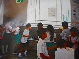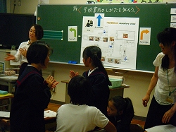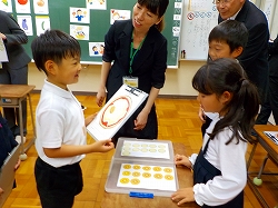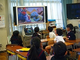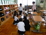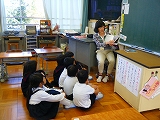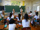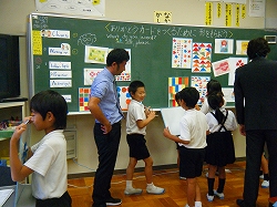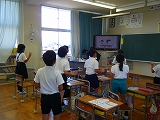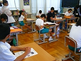 1年生は、英語の絵本の読み聞かせでした。2年生や3年生は、映像を見たり聞いたりしながら英語の発音をまねしていました。4年生と5年生(複式学級)は、先生が絵カードを見せながら発音したのを繰り返していました。6年生は、授業で使った英語シートを完成させていました。どの学年も積極的に活動していました。
