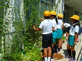 4・5年生が総合でエコカーテン(朝顔・フウセンカズラ・ゴーヤ)づくりをしています。今年の夏は大変暑く、水やりも毎日、交代で頑張りました。ツルが上まで伸び、葉がたくさん茂り、日陰を作ってくれました。そしてかわいい花にみんなが癒やされました。