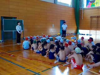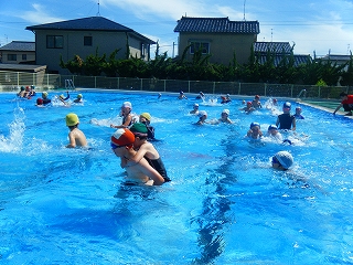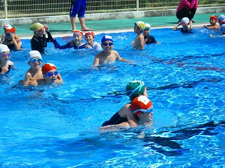 体操、シャワーをして、なかよしグループ毎にそーっと水の中へ。水の掛け合いのあと、6年生は1年生をおんぶして、全員でプール内を同方向に全速力で動き、流れるプールに大歓声。突然、担当の先生から「反対に回れー!」と声がかかり、一斉に反対を向いたら、大きな水の抵抗に遭い、驚きながらも子どもたちは大喜びでした。