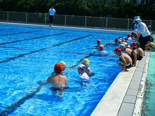 梅雨も一休み、プール開きには最高の青空。はじめに校長先生から「めあてを持ち、安全に」とお話しがあり、担当の先生から入り方の注意がありました。