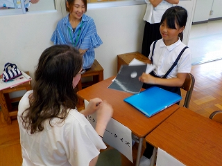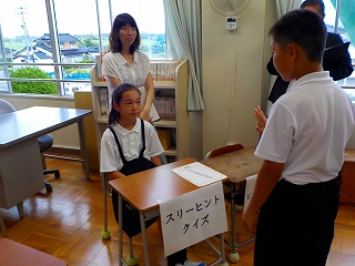 ウォーミングアップでは、アルファベットカードを使って歌とミッシングゲームをスピードに乗ってリズミカルに行いました。その後、”What’s this?” ”It’s ~.” を使ってある物が何かを尋ねるクイズを考えて出し合いました。アイ・コンタクトも意識して「Hint Please.」「That’s right.」など、言葉を交わしながら答えたり正解を伝え合ったりしました。