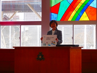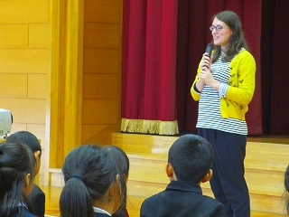 町の英語指導員の荒木先生が,朝の読み聞かせにの英語の本を読んでくださいます。