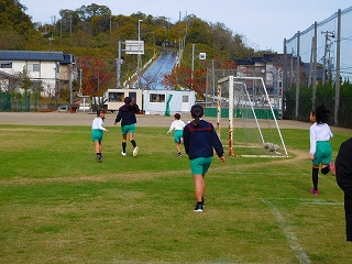 給食の後は、みんなでなかよし遊びです。グラウンドに出て走り回るグループがたくさんありました。緑の芝生の上で寝転んだり、座ったりして、思い思いに遊んでいました。