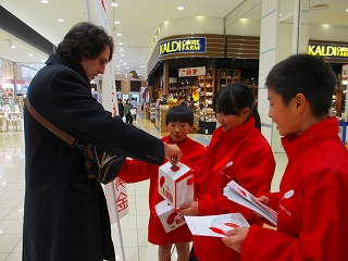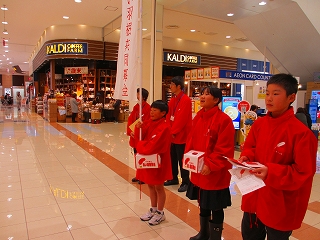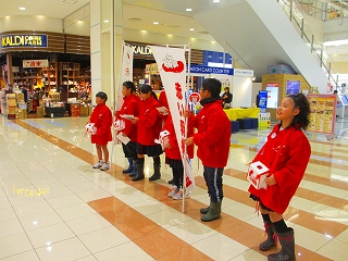 企画委員の子どもたちが、かほくイオンで、赤い羽根共同募金への呼びかけ活動に