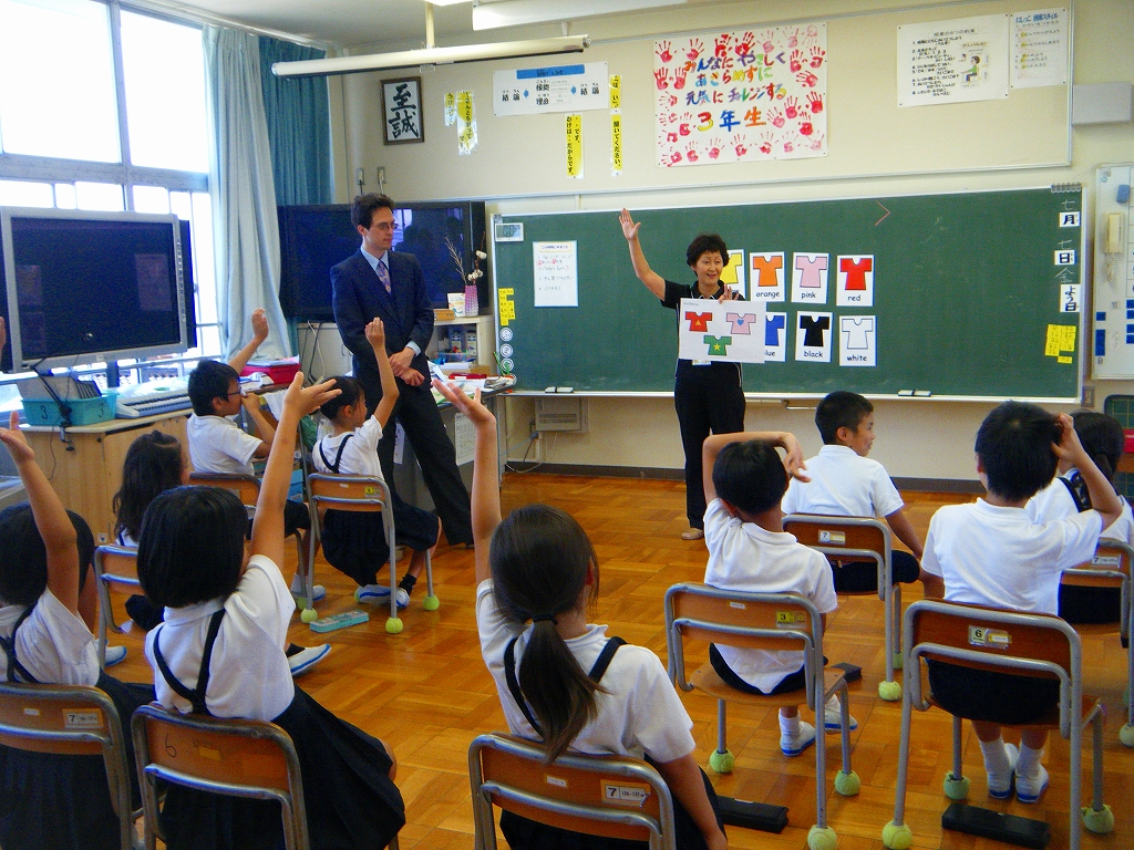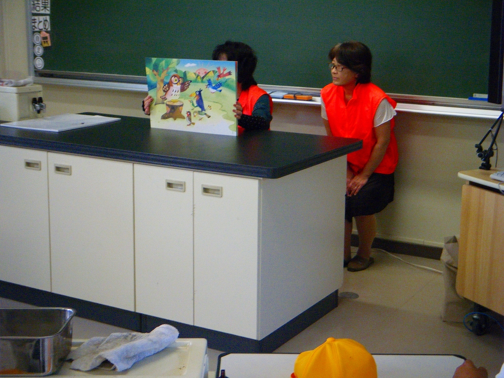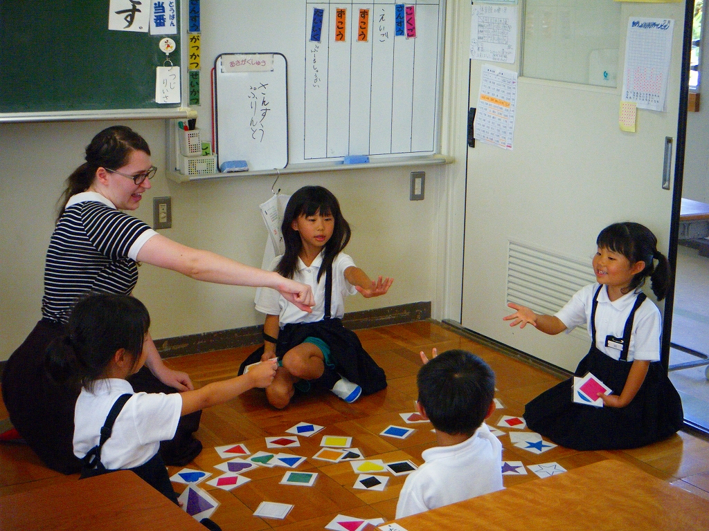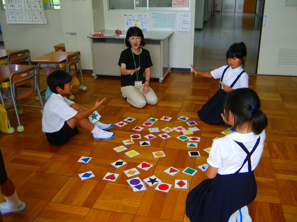 2017年7月13日 10時53分1年生はALTのソフィーさんの発音に合わせて元気に形や色を英語で発声し、その後、カード取りゲームに熱中しました。ゲームの中で色と形を英語でどんどん言っていました。暑さも吹き飛ばす勢いの大きな声でした。