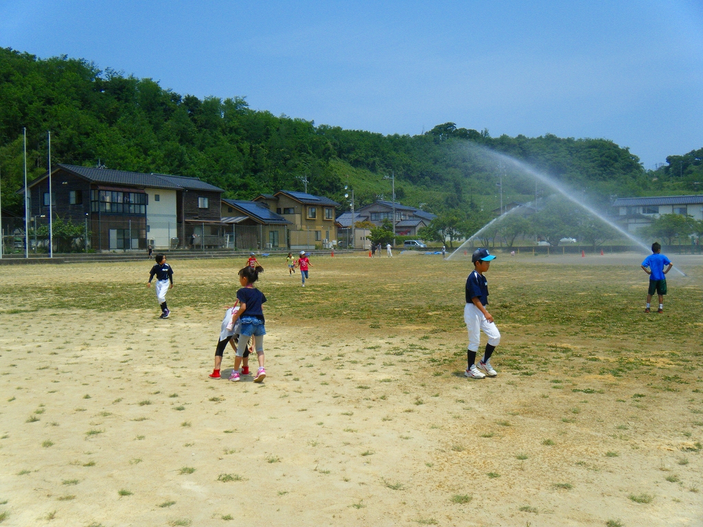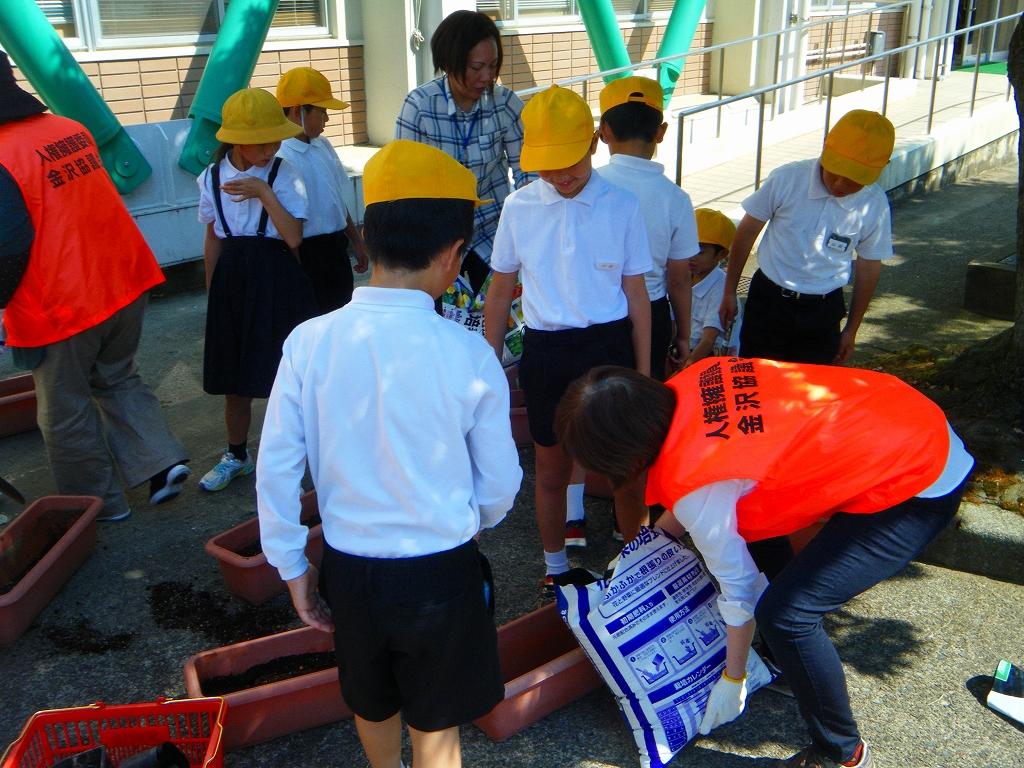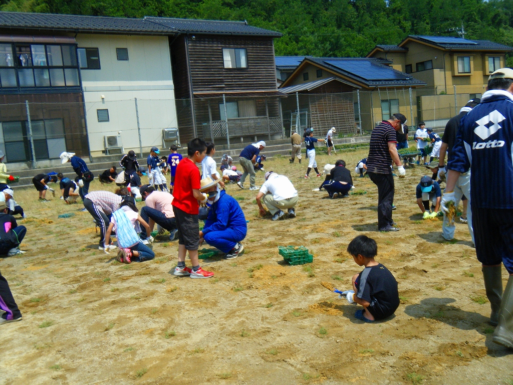 西荒屋小学校運動場の芝生化にあたり、内灘町長様、町議会議員の皆さまはじめ、内灘町の有志のみな様、地域の皆さま、保護者の皆さまにご参集いただき、芝生の苗30000株近くを植えることができました。子どもたちも大人に混じってせっせと植えていました。終わってから回転しだした3つのスプリンクラーに苗も子どもたちも大喜びでした。