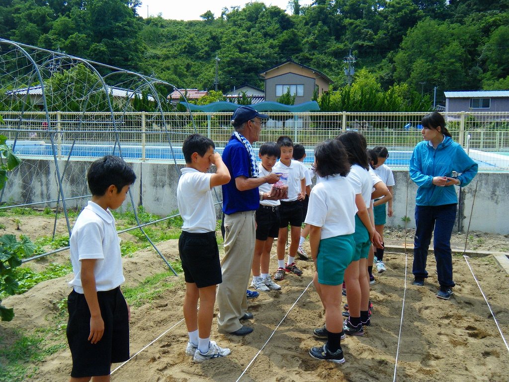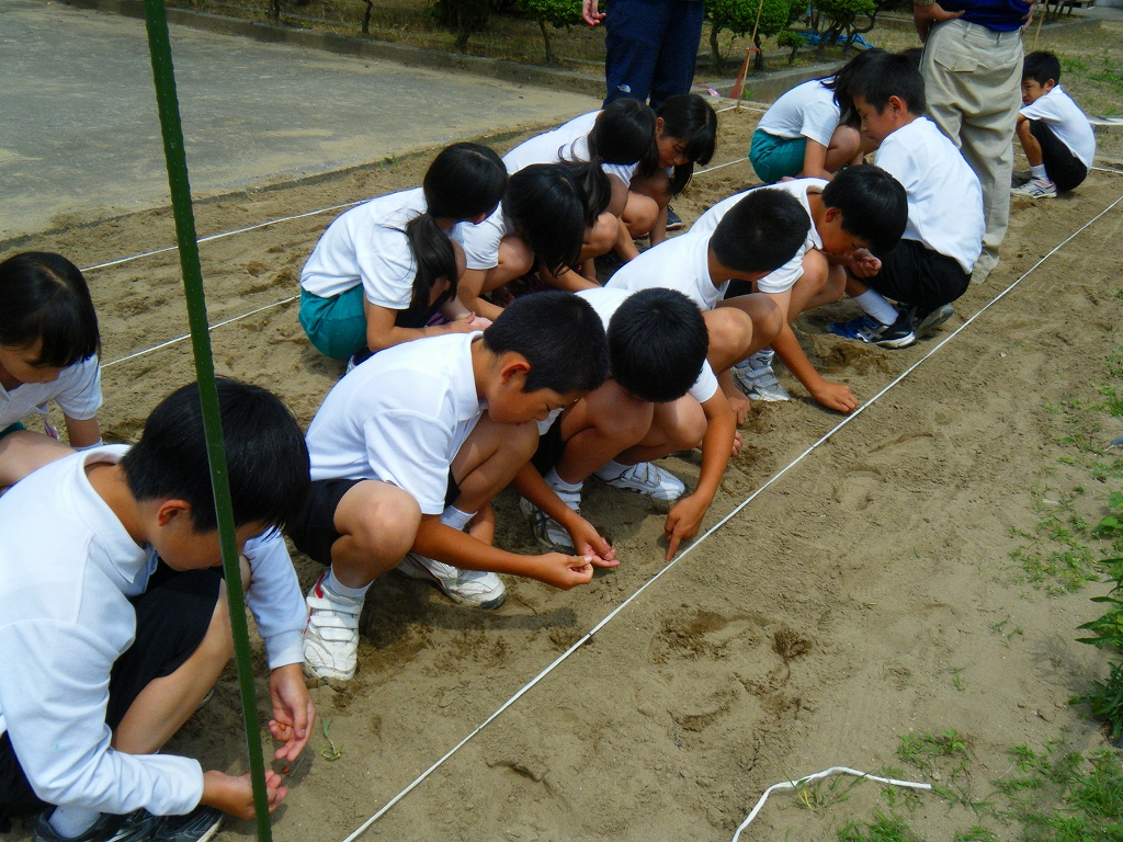 5年生が総合で、西荒屋特産のピーナッツ栽培をしていらっしゃる川辺さんからピーナッツを植えることを教えていただきました。初めての経験で、これからピーナッツの芽が出て、花が咲いて、どうなっていくのか興味津々です。餅つきのときに一緒に入れることができるといいですね。