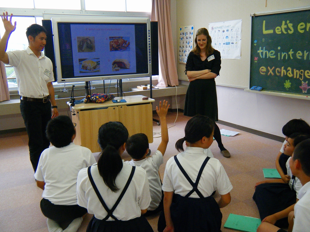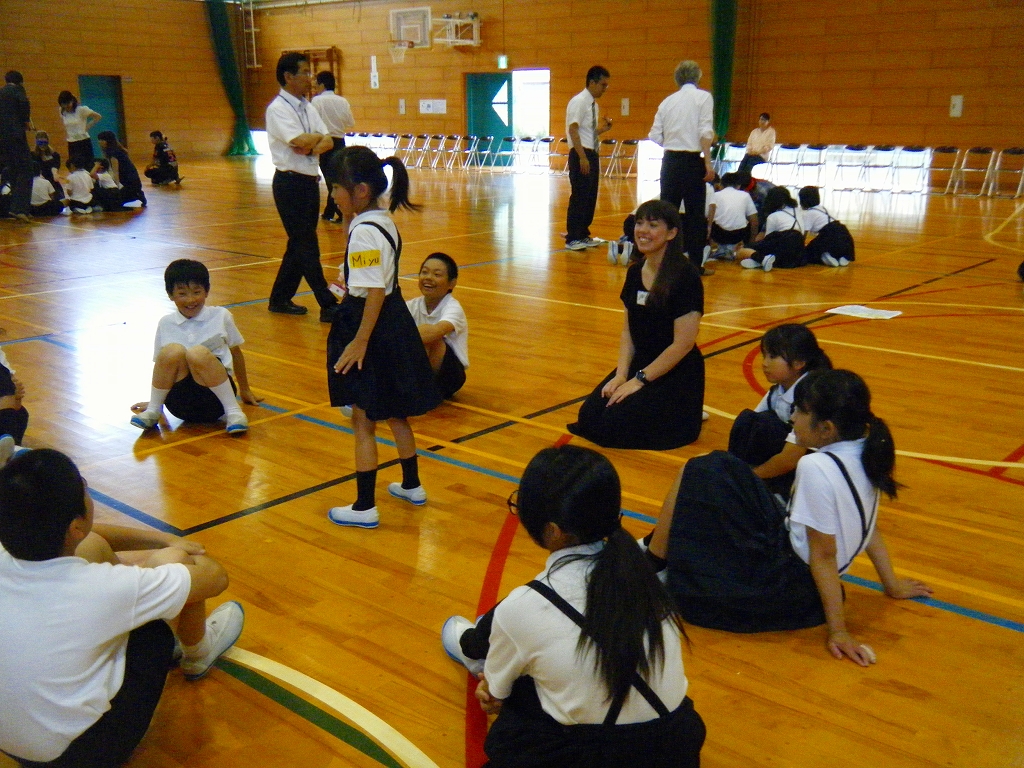 県内で活躍されている国際交流員さんや英語指導助手(ALT)さん8人をお迎えし、全校で英語での学校紹介やインタビュー、ゲームなどを行いました。後半は、5・6年生が各教室でお客様の出身国のお話を聞くなど、交流を深めました。