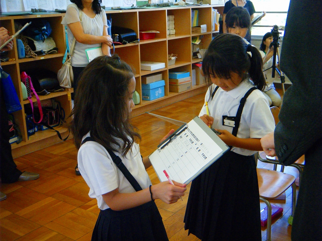 子どもたちは、緊張しながらも、習った英語を話し、相手の英語を聴き取ろうと頑張っていました。英会話が通じることに喜び、活動を楽しむことができたようでした。お客様から「恥ずかしがらずに英語を話してくださいね。」とエールをいただきました。これからもどんどん英語を使っていきましょう。