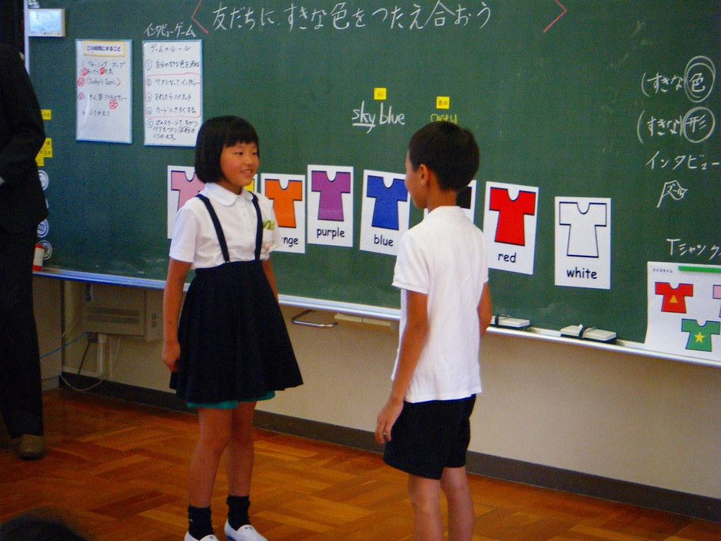 初めに、CIR(国際交流員)さんや英語専科の先生のやりとり[What color do you like?-I like ~.]を聞いて、その言い方をチャンツのリズムに合わせて練習しました。その後、友だちと好きなTシャツの色をインタビューし合い、CIRさんや英語専科の先生、担任の先生に聞いてもらいました。みんなの前で堂々と話せると「Good!」「Great!」など、たくさん英語でほめてもらいうれしそうでした。