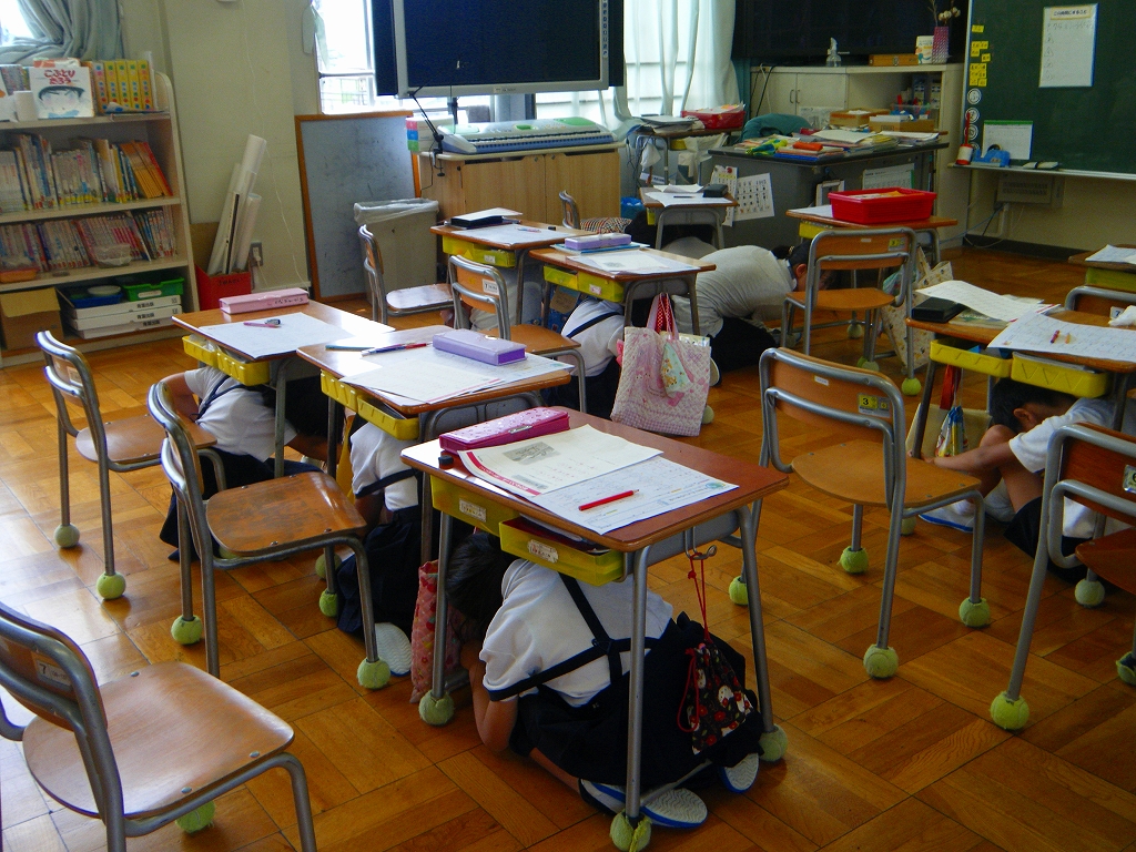 県民一斉防災訓練に合わせて、緊急地震速報(町の防災放送)を聞いて、その場に「しゃがむ・かくれる・じっとする」を約1分行いました。どの学級も机の下でじっとしていました。プールサイドではしゃがんで頭を守るようにしていました。日頃からの訓練を大事にしていきましょう。