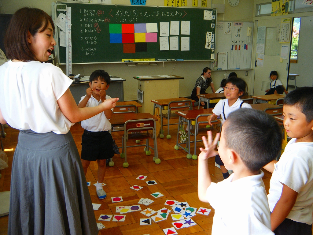 1年生はALTのソフィーさんの発音に合わせて元気に形や色を英語で発声し、その後、カード取りゲームに熱中しました。ゲームの中で色と形を英語でどんどん言っていました。暑さも吹き飛ばす勢いの大きな声でした。