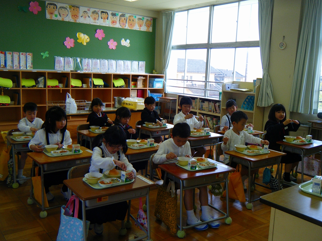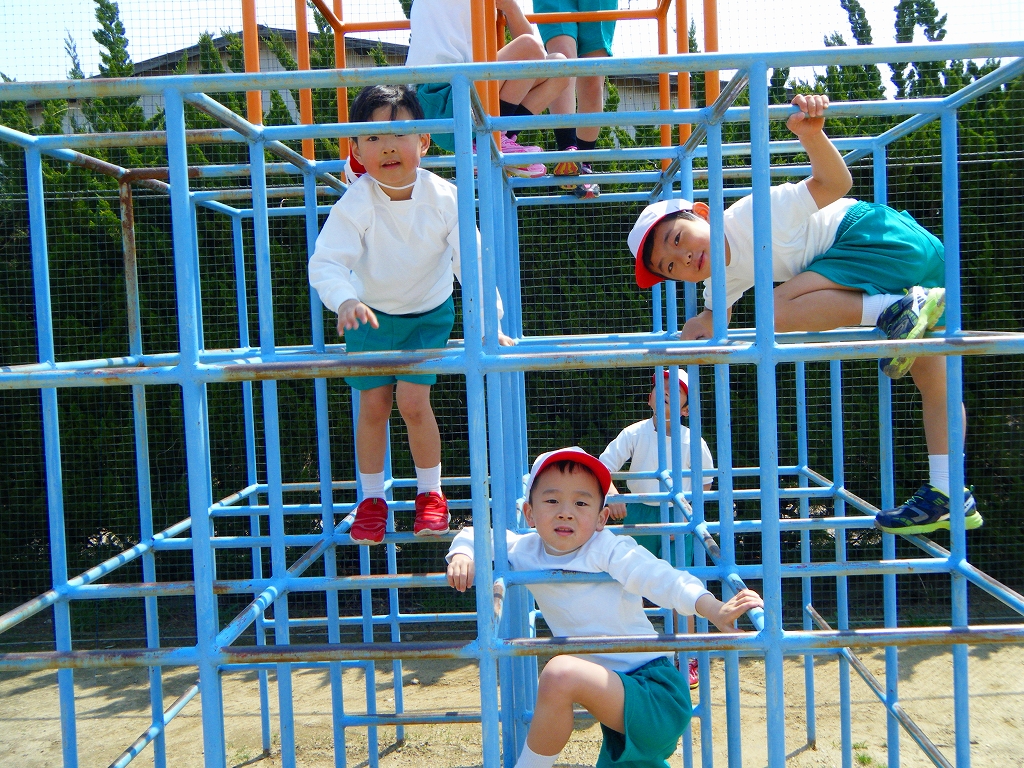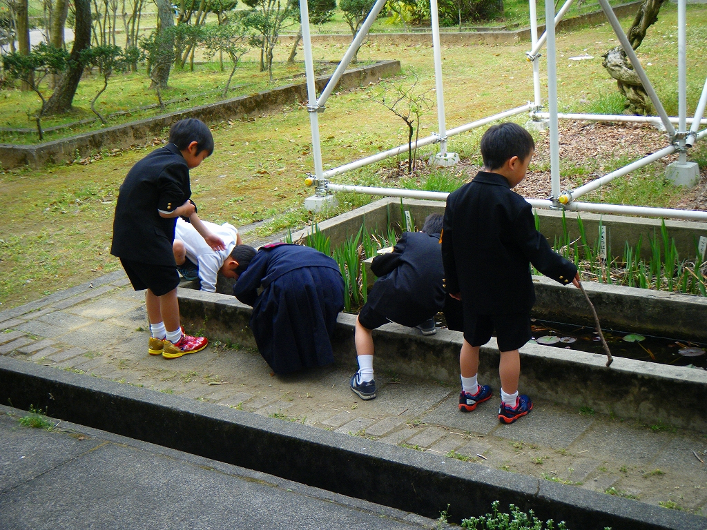 1年生も給食が始まり、もりもり食べています。体育ではジャングルジムをみんなで楽しみ、休み時間には、池のオタマジャクシすくいに夢中です。