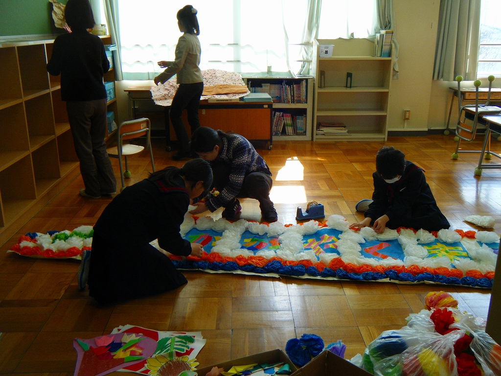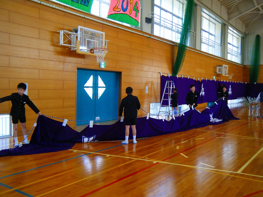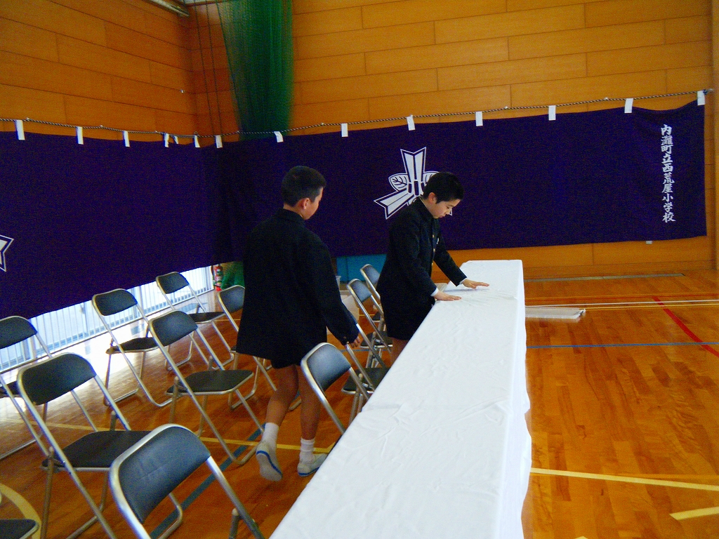 新6年生19名が,明日の入学式の準備をしてくれました。会場の幔幕張りや椅子出し、各所の掲示板や1年教室等の飾り付けなど、よく考えながらきびきびと行っていました。早くも最高学年としての自覚が感じられました。ありがとう。