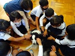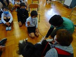 聴診器で、犬の心臓の音を聞いたり、あいさつをしてから、触ったりしました。犬と出会った時「電柱」や「岩」になることも学びました。