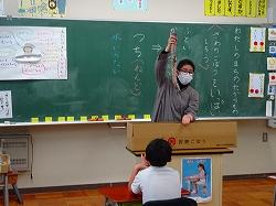 一年生の道徳で、350年前からずっと受け継がれ守られてきた、沢野ごぼうの話を今年もしていただきました。子どもたちは、沢野ごぼうを触ったり、匂いをかいだり、本物にふれ感動した様子でした。「ずっと守っていきたい」とおっしゃる平田さんの言葉が心に残りました。