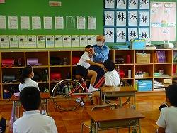 4年生の交通安全教室では、安全な自転車の乗り方について教えていただきました。実際に自転車にまたがって、どのように後方確認をすればいいかなど、とても分かりやすく教えていただきました。