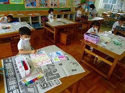 1年生たちは、クーピーやクレヨンとは違った絵筆の感覚を楽しみながら、画用紙に、いろいろな線を描いていました。