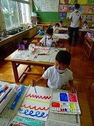1年生たちは、初めて絵の具を使っていろいろな模様を描きました。